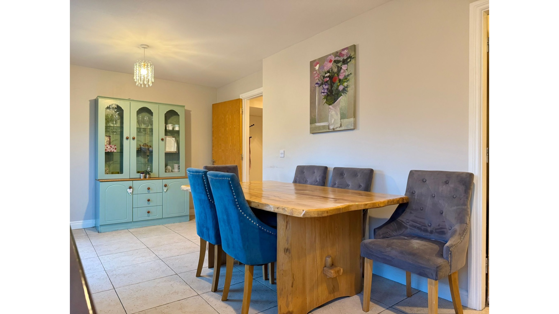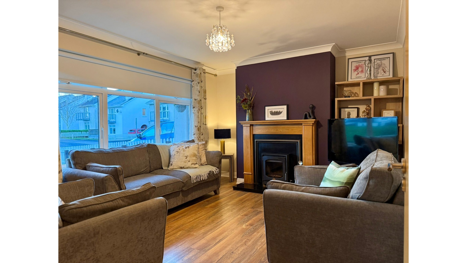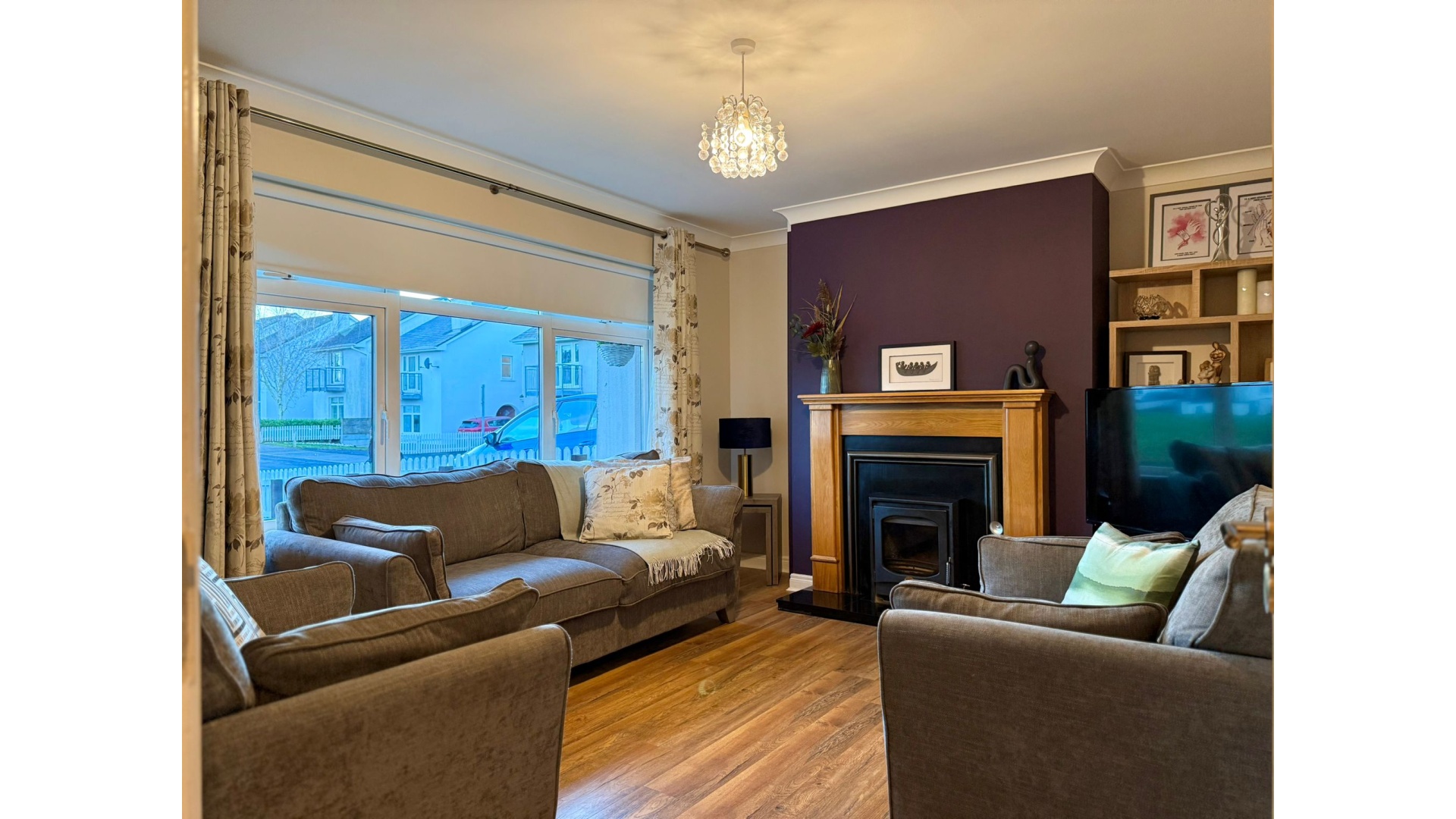 Nestled within a quiet cul-de-sac in the sought-after River Village development, this property offers generous living accommodation along with a superb blend of modern features. On arrival, a welcoming and spacious hallway sets the tone for the quality that follows, with a staircase leading to the first floor and access to all principal rooms. The front sitting room enjoys excellent natural light and benefits from a solid fuel back boiler, forming a cosy focal point. A guest WC completes the downstairs accommodation.