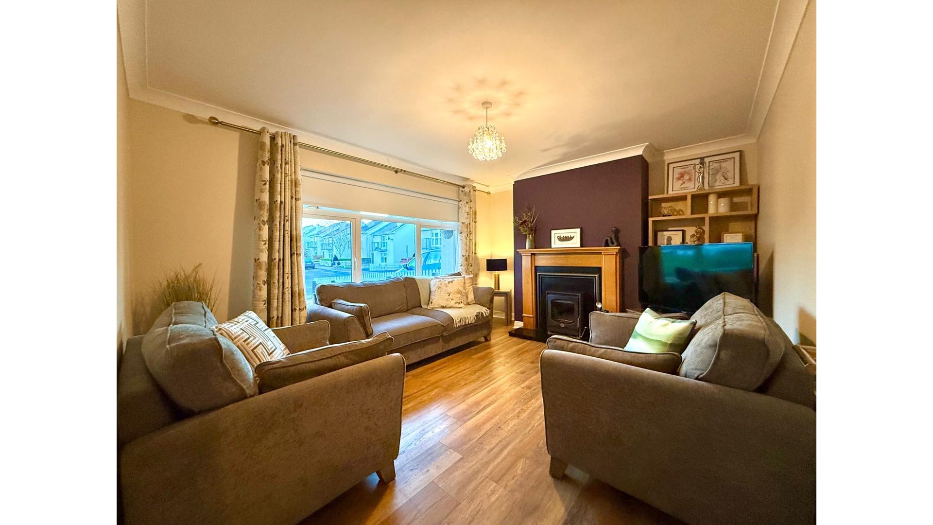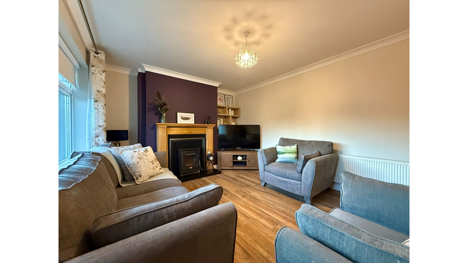 Externally, the property continues to impress. To the front, a tarmac driveway and block-built boundary walls provide a clean and secure approach. Side access leads to a generous rear garden, enhanced by mature trees, a concrete patio area ideal for outdoor dining, and two storage sheds—one at the side and one at the rear of the garden. The heating system has also been comprehensively upgraded, with a dual system combining solid fuel back boiler and a newly installed gas system with a new gas boiler.