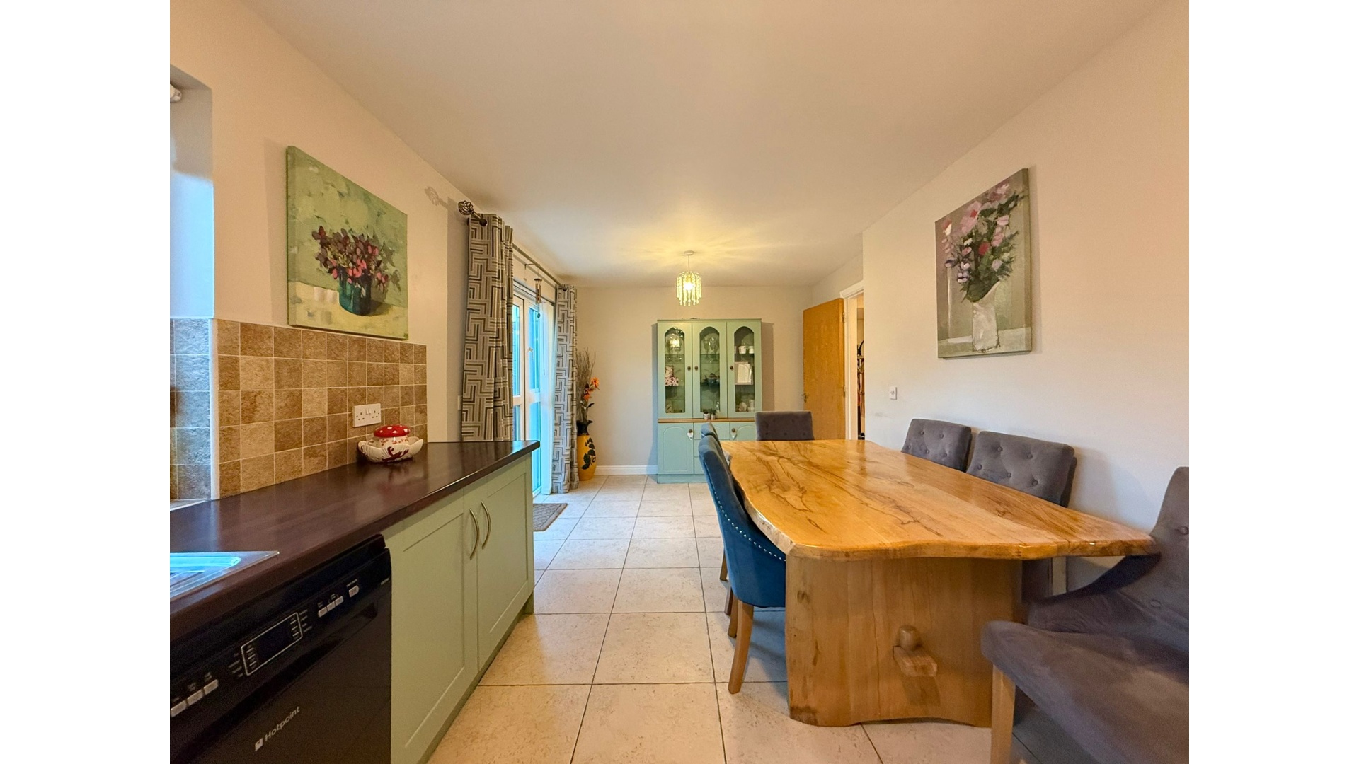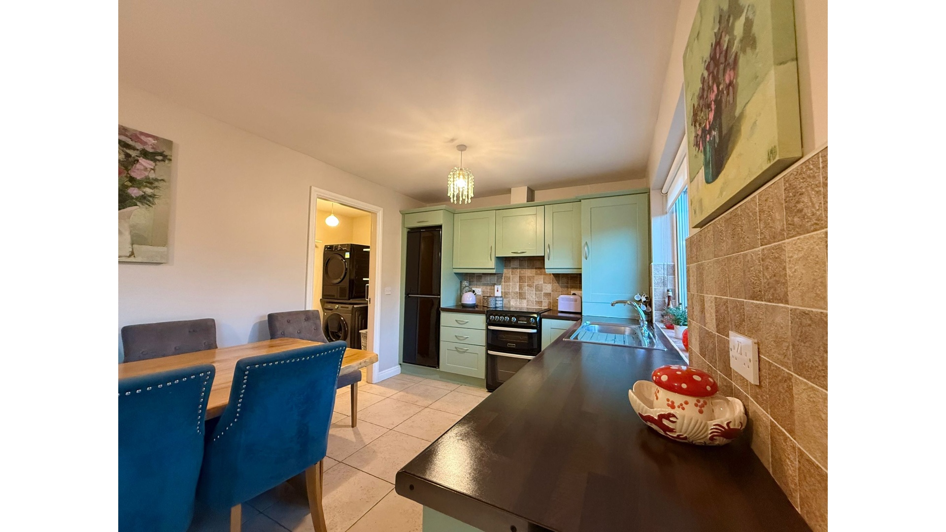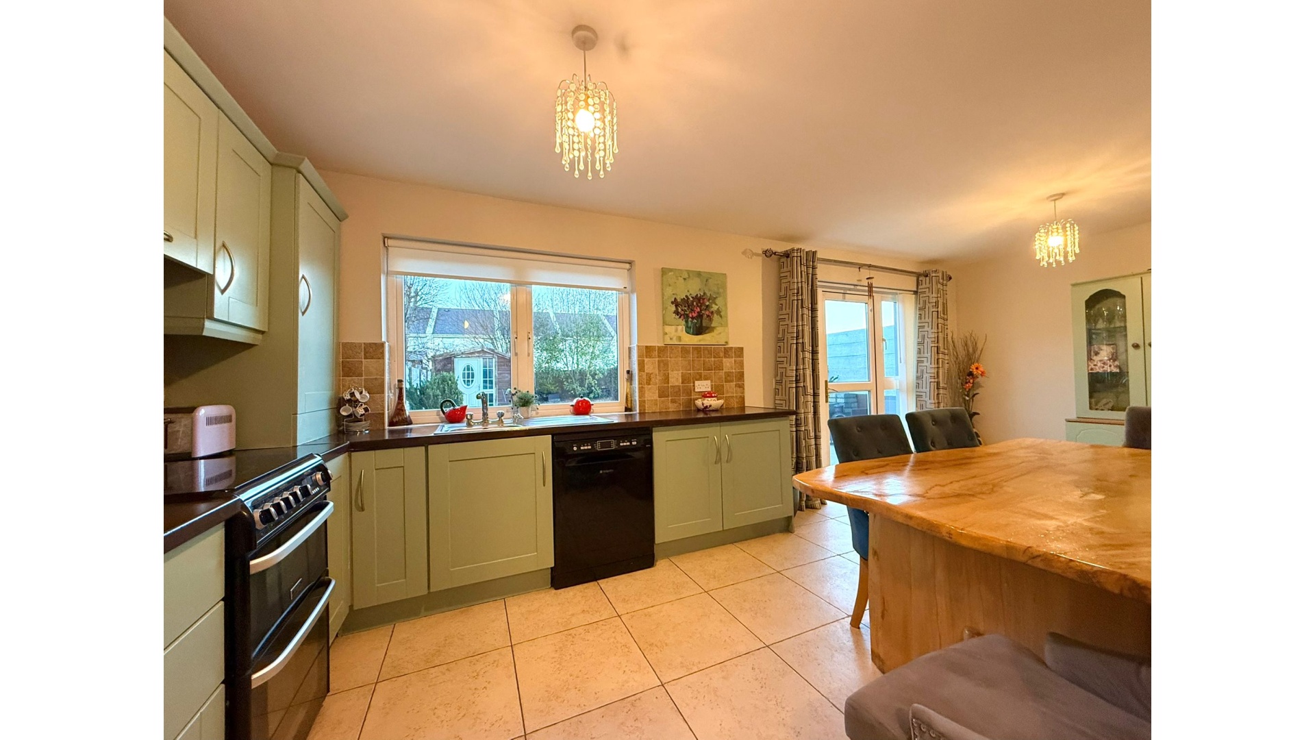 To the rear, the open-plan kitchen and dining area is one of the standout spaces of this home. Flooded with light, it features a stylish fitted kitchen, generous worktop and storage space, and a dining area that opens directly onto the rear garden through French doors. Off the kitchen lies a practical utility room, neatly tucked away and perfect for everyday convenience.
