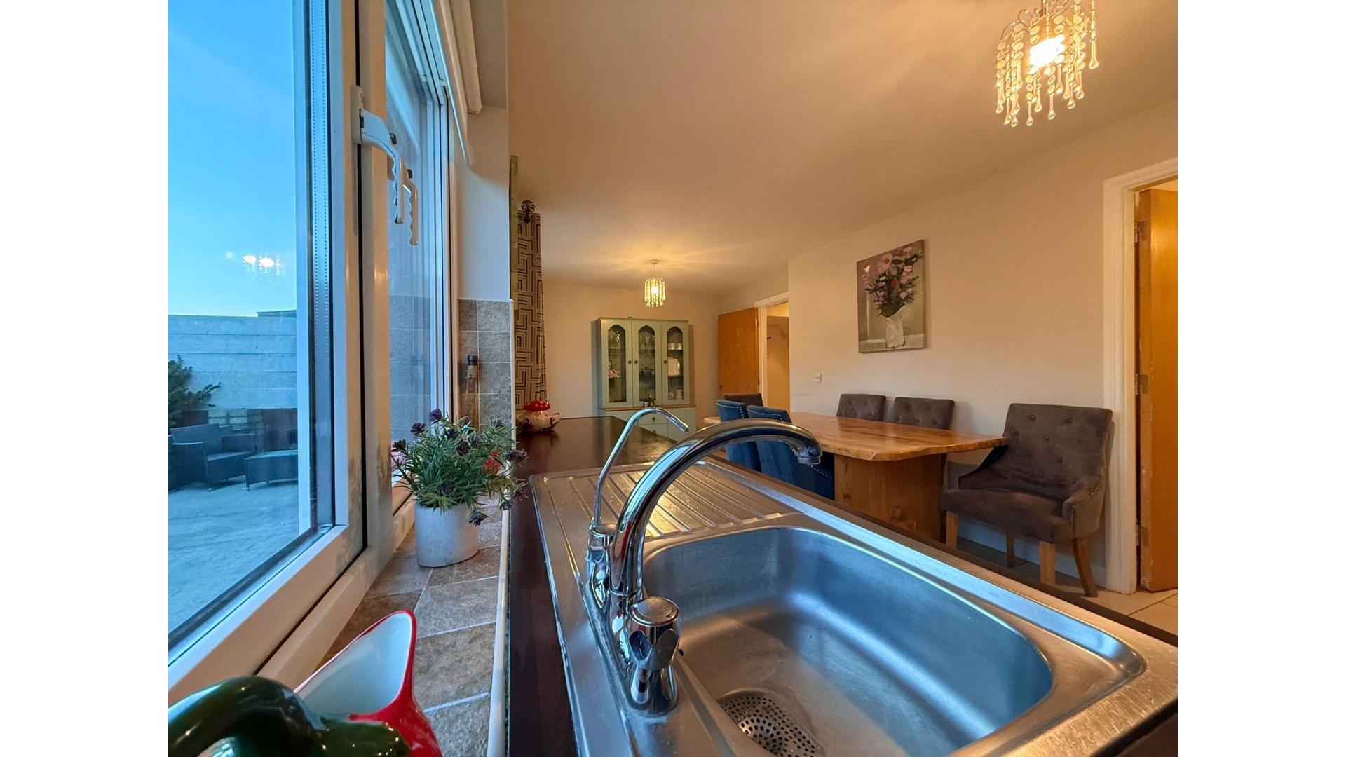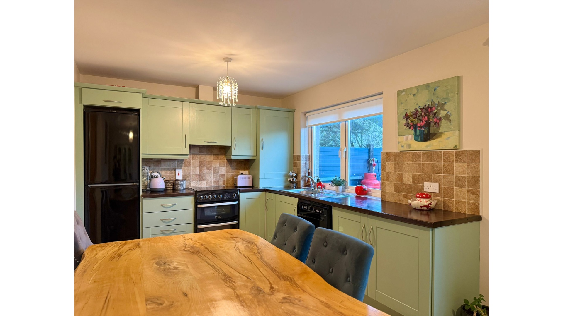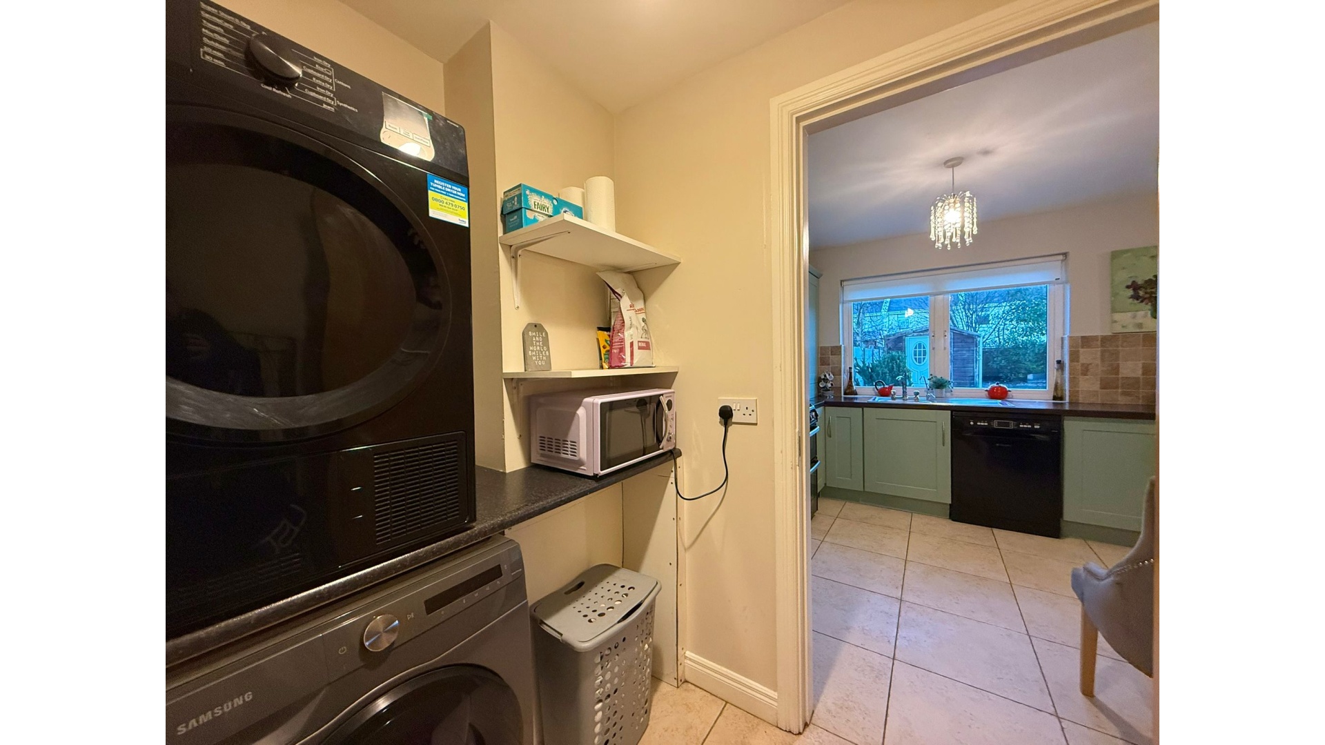 To the rear, the open-plan kitchen and dining area is one of the standout spaces of this home. Flooded with light, it features a stylish fitted kitchen, generous worktop and storage space, and a dining area that opens directly onto the rear garden through French doors. Off the kitchen lies a practical utility room, neatly tucked away and perfect for everyday convenience.